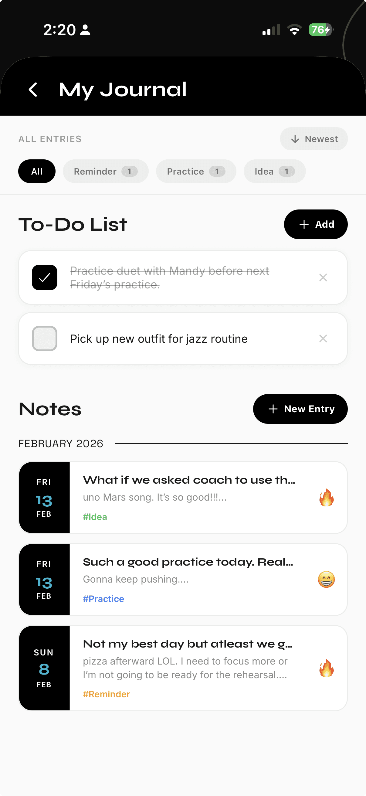 Store everything in your personal journal, from practice notes, to-do lists, and reminders so you never forget anything.